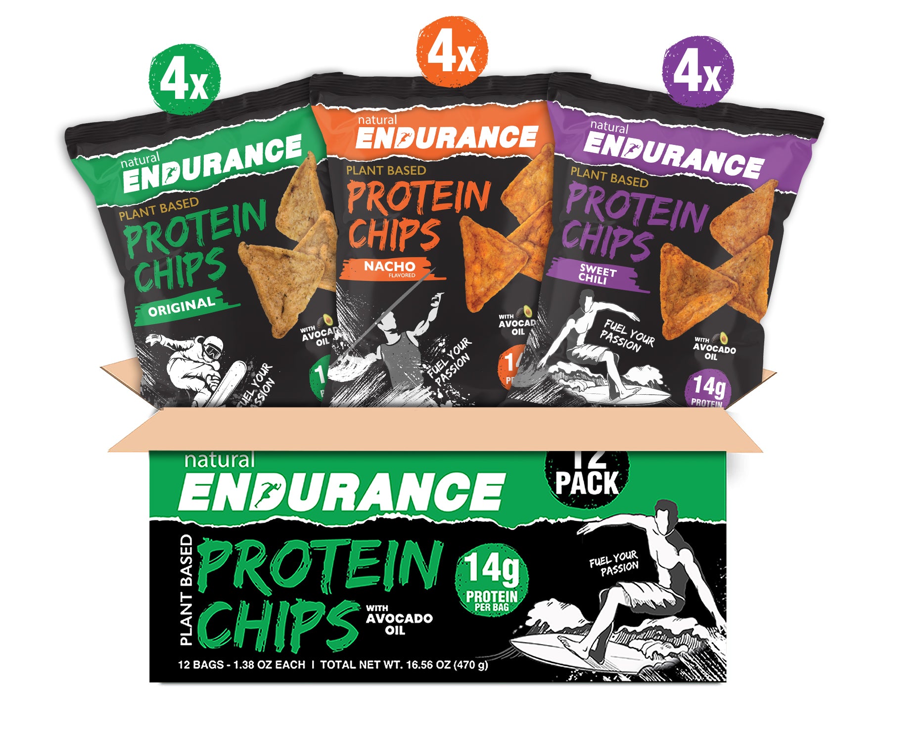 Natural Endurance™ plant-based protein chip variety pack takes a fan favorite combo of our Savory Herb Original blend and packs it with our authentic Vegan Cheesy Nacho, along with Spicy Sweet Chili all fueled up with 14g of plant-based protein per serving.