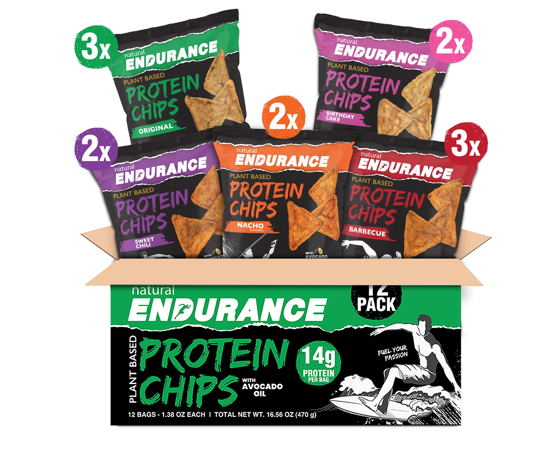 Natural Endurance™ plant-based protein chip variety pack takes an unmatched combo of 5 different delicious flavors and fills it with 14g of plant-based protein per serving.